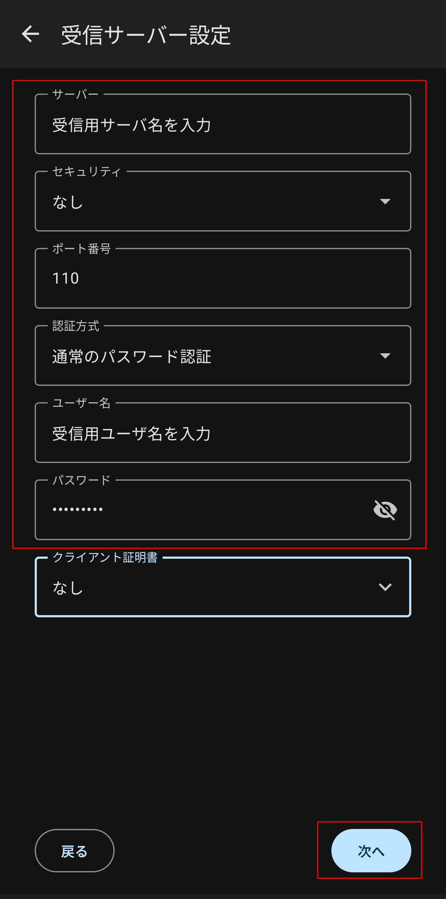 ・パスワード:受信用パスワードを入力 以上を入力後「次へ」を選択します。