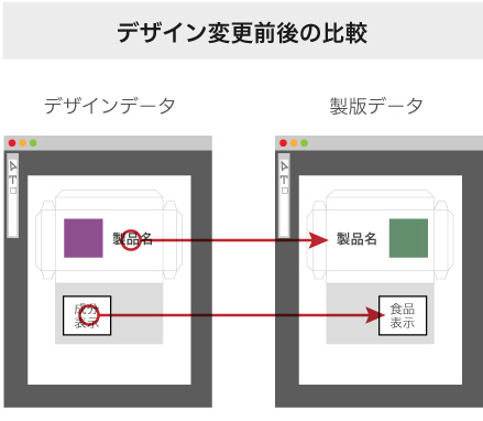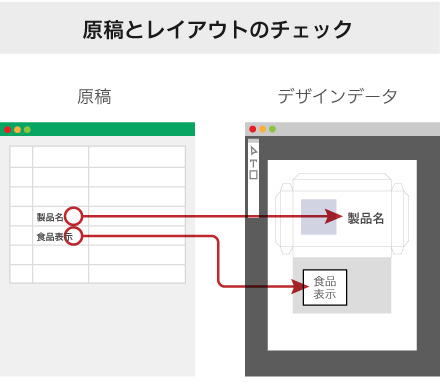 パッケージに記載される原材料や成分表などの原稿と、デザイン版下の文字を照合して差異を発見できることが重要です。 商品名や成分表記など、そもそもの間違いがあってはならないミスを防ぎます。