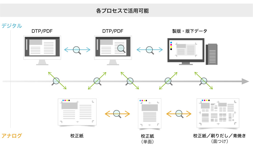 製造工程によって検査対象は異なります。版下、青焼きデータなどのデジタルデータから校正紙、現物見本のアナログスキャンデータまで、全ての工程において照合できることが求められます。