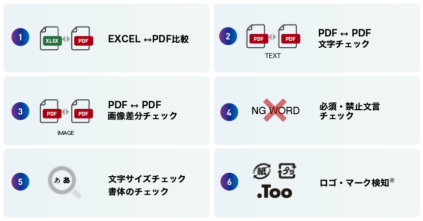 変更前と変更後の比較だけでなく、ロゴマークや表記がそもそもあっているかをチェックするような校正も可能です。