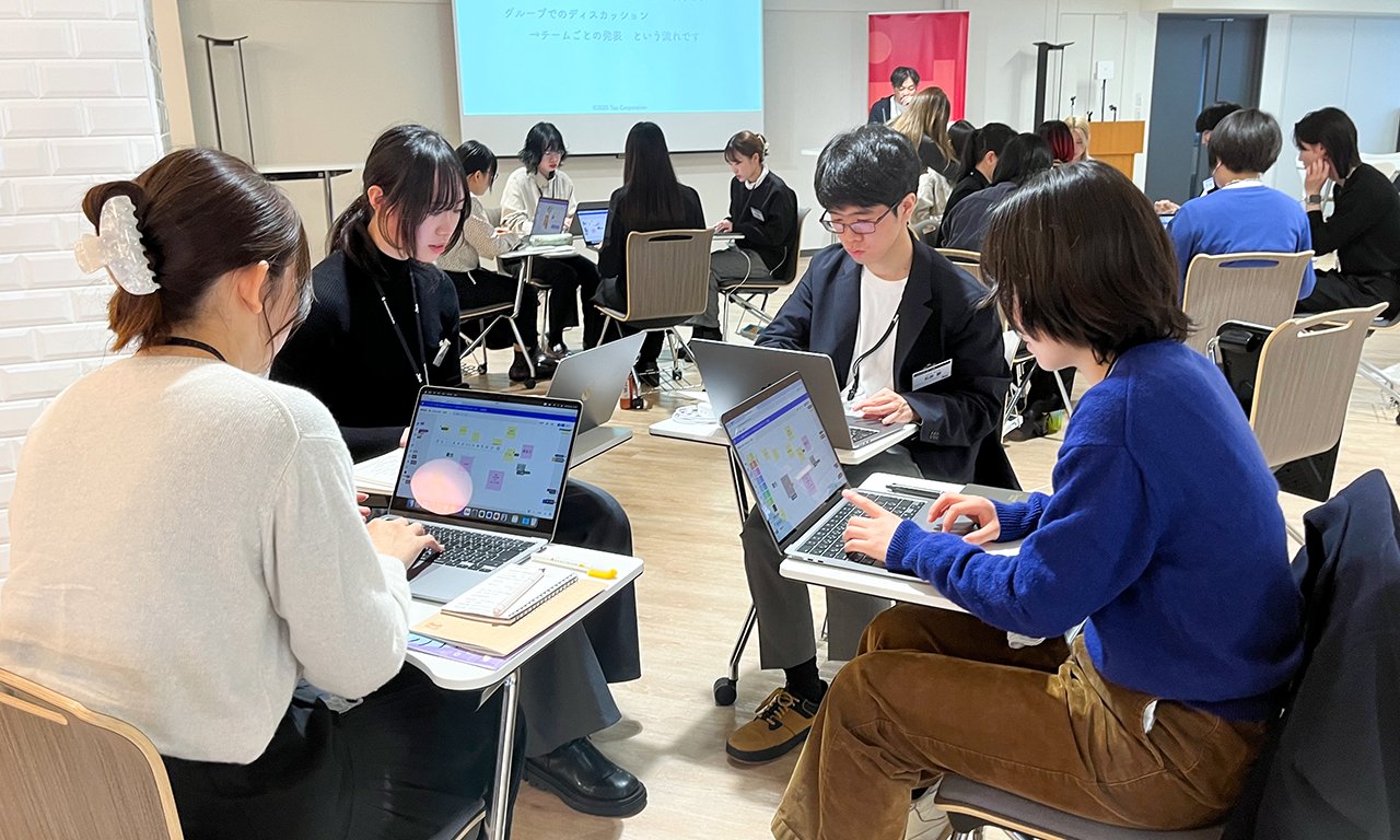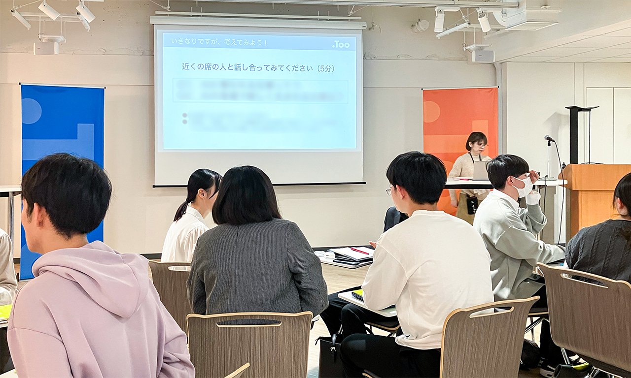 今回行なったのは、プロジェクトで行なっている「Adobe Fresco体験教室」をアレンジした内容です。当日は、Too虎ノ門本社に10名の学生さんにお越しいただきました。学生の皆さんは、文学部、工学部、教育学部など専攻も様々で、今回初めてiPad&Apple Pencilに触れるという方も!冒頭でプロジェクトの活動やFrescoの機能をご紹介し、早速メインのワークに入ります。