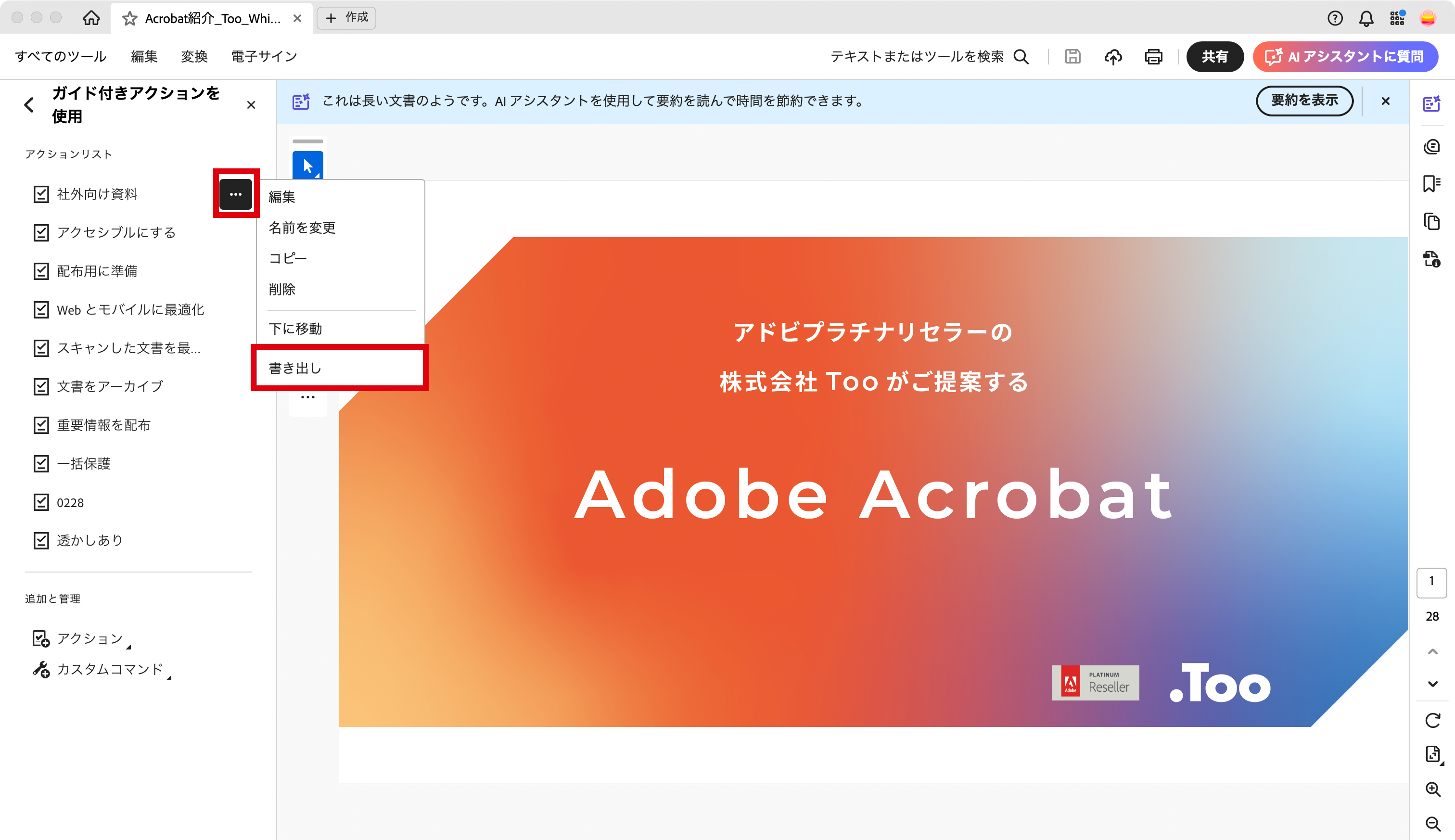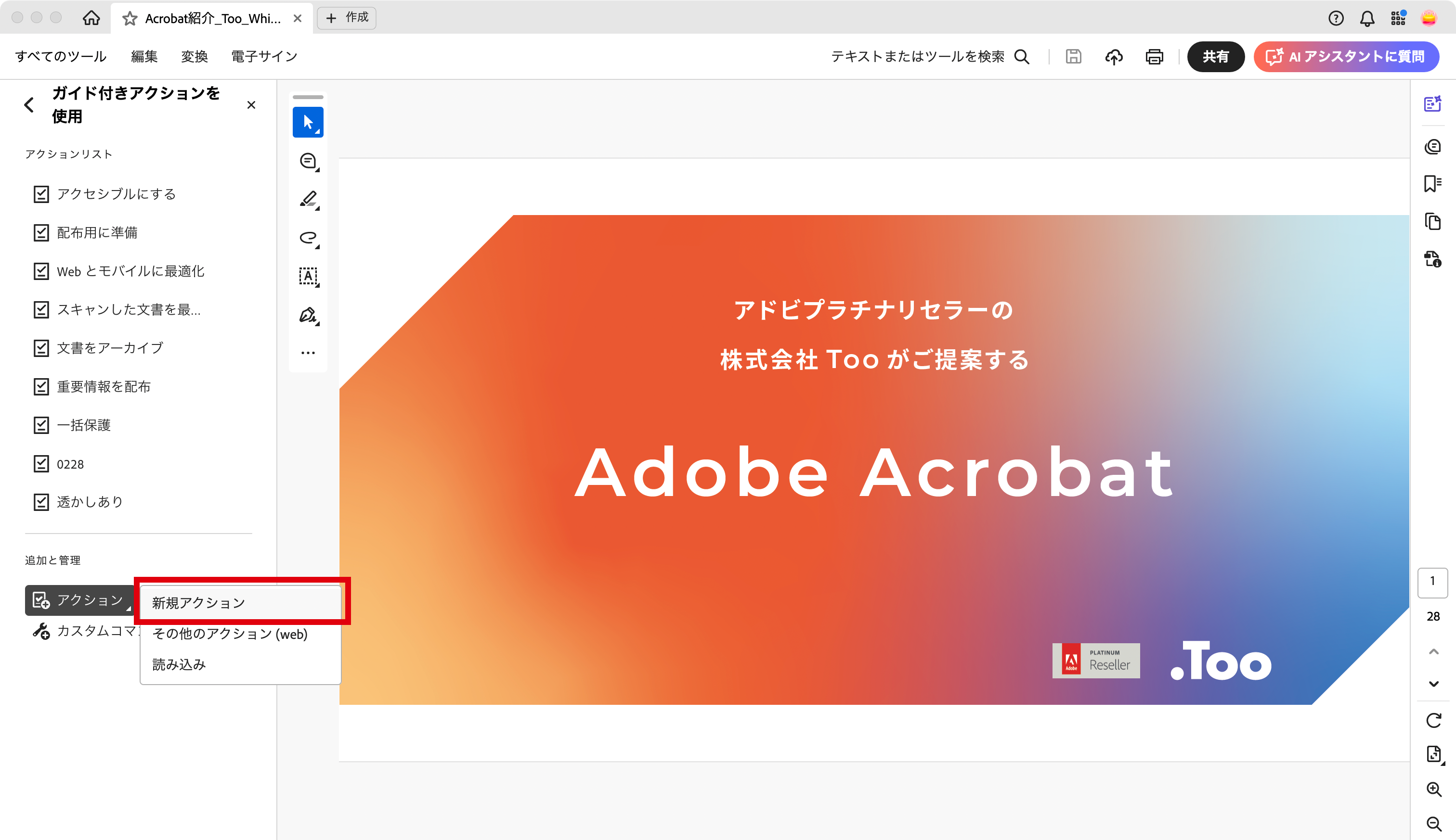 Acrobat Proの「アクションウィザード」は、PDFの定型作業を効率化し、業務品質の向上と作業時間の削減を同時に実現できる強力な機能です。