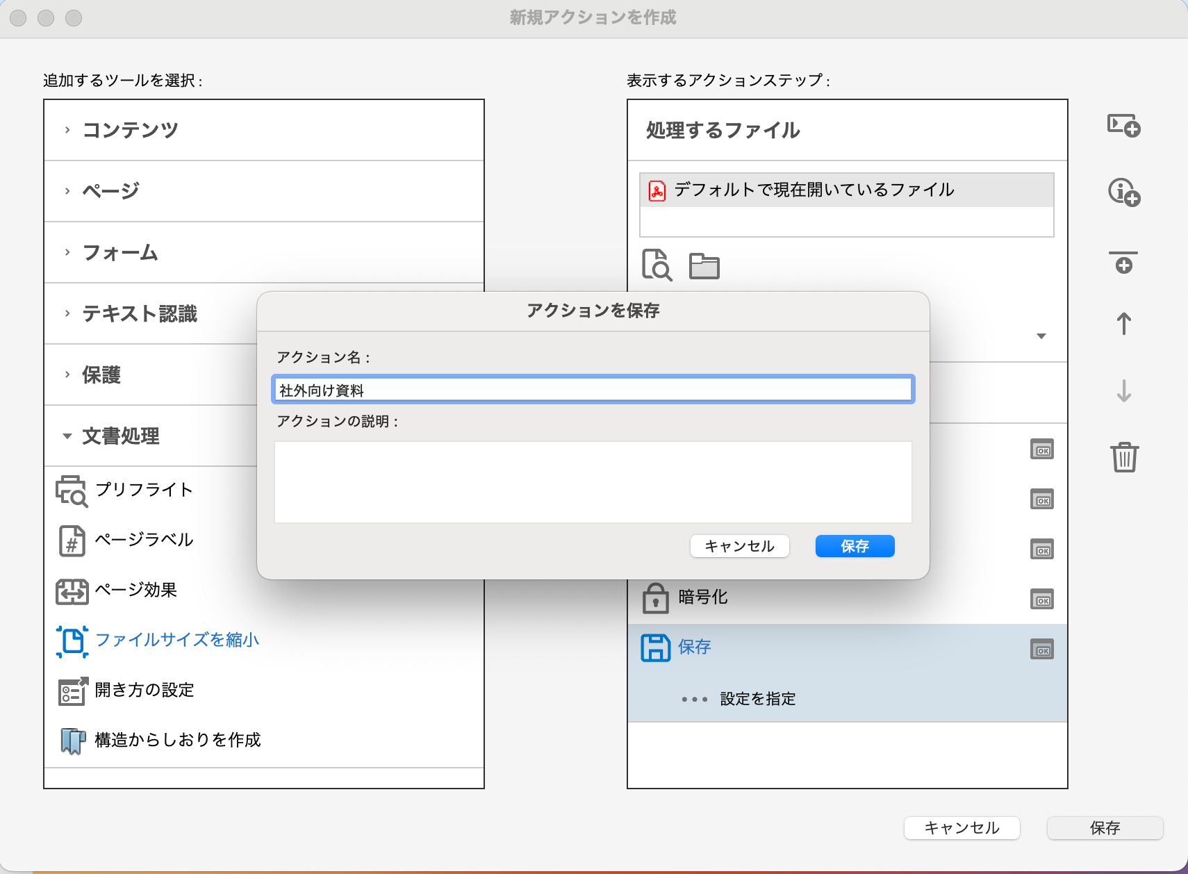 アクションウィザードとは、Acrobat Proに搭載されたPDF作業の自動化機能です。 複数の処理をまとめて"アクション"として登録することで、ボタン1つで同じ手順を繰り返し実行できます。