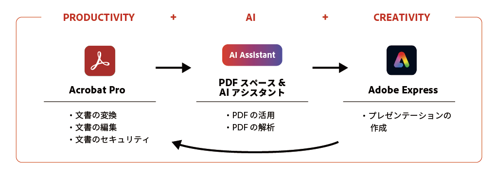 Acrobat Studioは、Acrobat・AI・Expressが密接に連携し、PDFの修正や変換や大量のPDFの活用から、 資料に自動作成までを1つのプラットフォームで実現できます。
