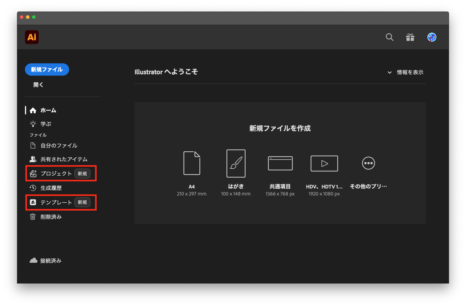 テンプレートはAdobe Expressのテンプレートを検索・編集できる機能ですが、Illustratorで直接扱うものではなく、選択するとWebブラウザが起動しExpress上で編集を行います。「Adobeアプリ×Express」の連携が、よりシームレスに進化しています