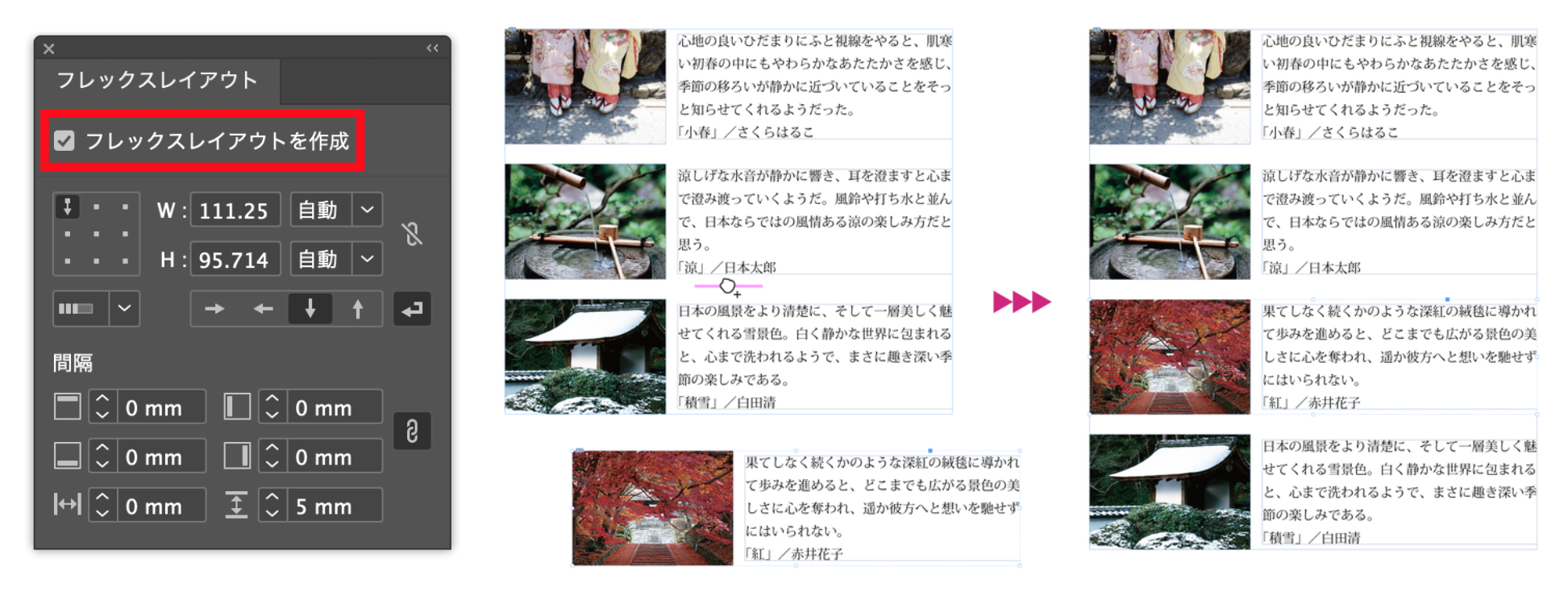 フレックスレイアウトパネルで「方向」「整列」「配置」「間隔」を設定しておくと、コンテンツの追加、削除、サイズ変更時にもレイアウトが自動調整されるので、手動調整が不要です。Illustratorユーザーにもぜひオススメしたい新機能です。