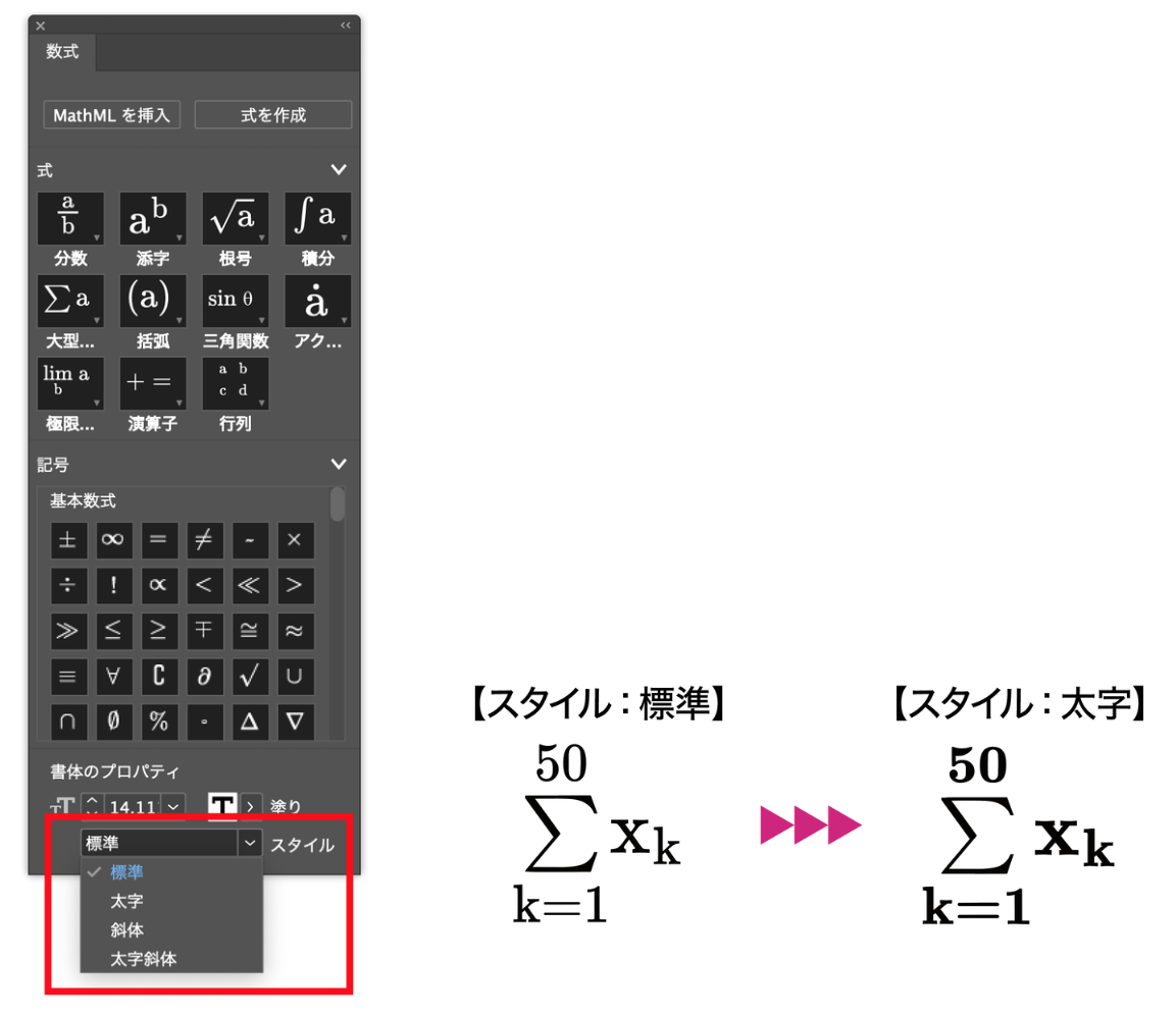 前バージョンで導入された数式パネルに、フォントスタイルが追加されました。