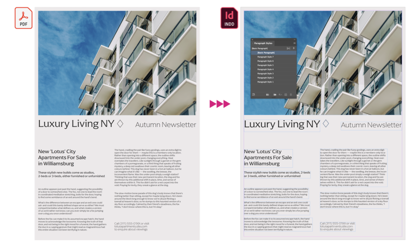 PDFファイル / IllustratorファイルをInDesignドキュメントに変換し、編集することができるようになりました。変換する際に段落スタイルも作成されます。容量やページ数には制限があり、まだ英語版のみの対応のため、今後の日本語対応に期待です。