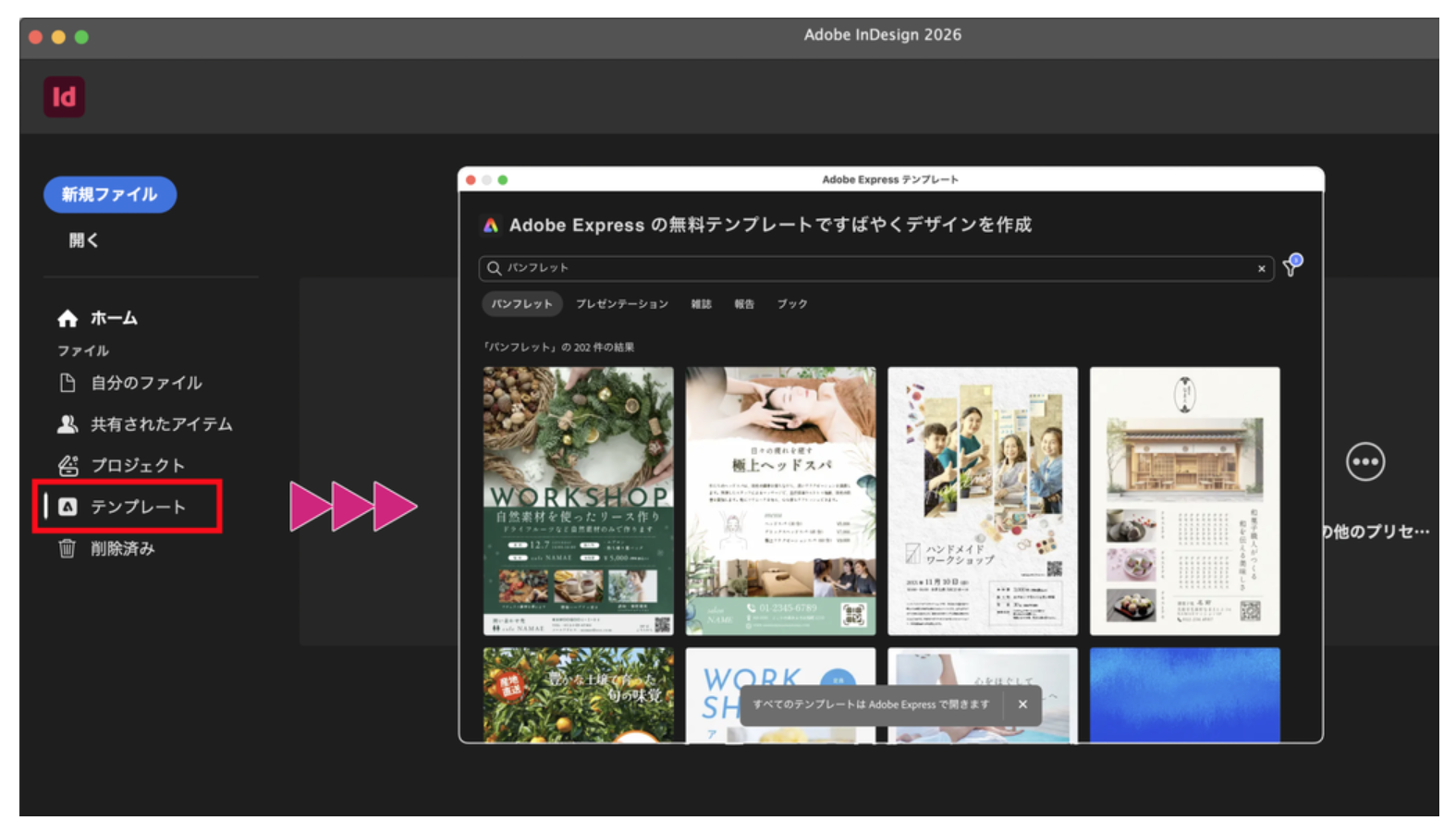 アプリケーションのホーム画面からAdobe Expressのテンプレートへ直接アクセスできるようになりました。