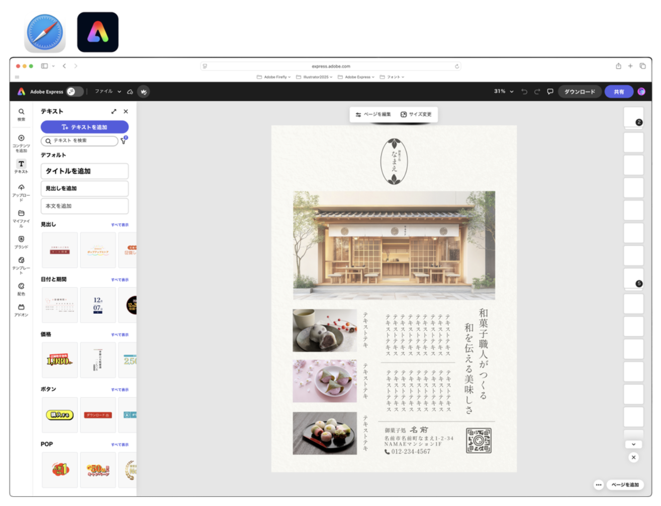 テンプレートを選択すると各アプリケーション内ではなくWebブラウザ上でAdobe Expressが起動し、テンプレートが開かれます。 これにより、Adobe Expressへのアクセス、編集が容易になります。