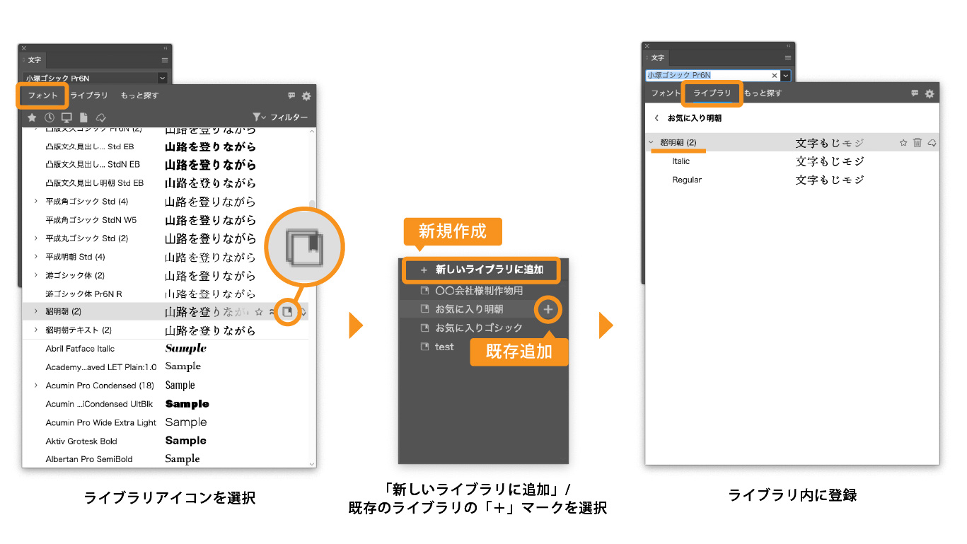 よく使用するフォントを「お気に入り用のライブラリ」としてまとめておくと制作の度にフォントを探す手間を省くことができます。また、クライアントごと・案件ごとにフォントセットを作成すれば、毎回の制作がスムーズに。フォントのライブラリはCCライブラリと連携しているため、他のアドビアプリケーションでも利用可能な点もポイントです!