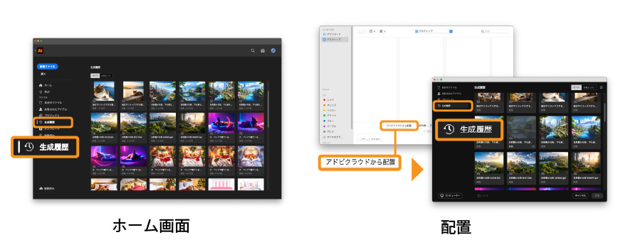 ファイルを開く際や、画像を配置する際に「生成履歴」からAdobe Firefly web版で生成した画像を選択できるようになりました。ファイルを開く際はホーム画面から、画像を配置する際は「ファイル」メニュー>「配置」>「アドビクラウドから配置」を選択し、「生成履歴」を開きます。ここから配置したものは埋め込み配置となります。