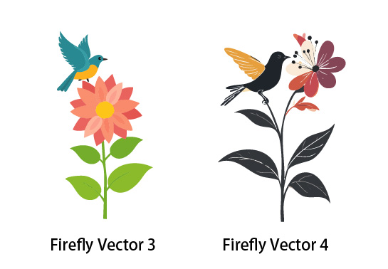 「ベクターを生成」時に「Firefly Vector 3 / Firefly Vector 4」でイメージモデルの切り替えができるようになりました。同じプロンプトを使用し、それぞれのイメージモデルで生成したオブジェクトを見ると、「Firefly Vector 4」の方がクオリティが上がっていると感じます。