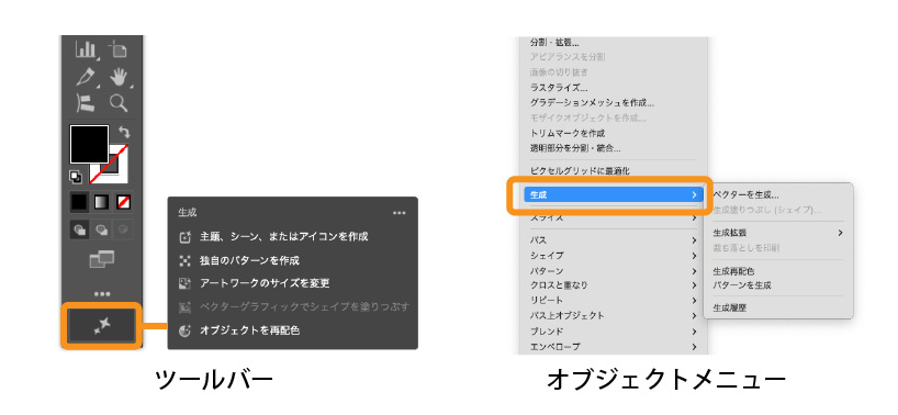 Illustratorで使える生成AI機能がツールバー下部や「オブジェクト」メニュー>「生成」に集約されました。生成クレジットが必要な機能もあるため注意が必要です。