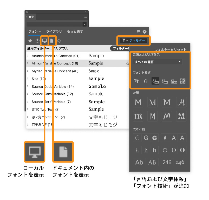 フィルター機能もアップデートされました。フォントのタブ上部に「ローカルフォントを表示」「ドキュメント内のフォントを表示」のフィルターボタンが追加されています。また、フィルターを開くと「言語および文字体系」や「フォント技術」でのフィルタリングも可能です。