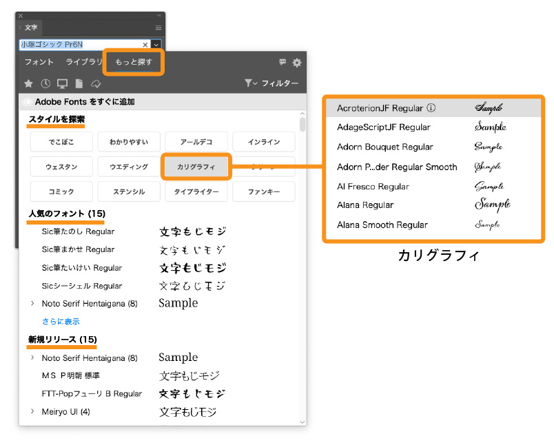 Adobe FontsのWeb版でおこなっていたフォントの検索や絞り込みを、Illustratorの「文字」パネル上でスムーズにおこなうことができます!