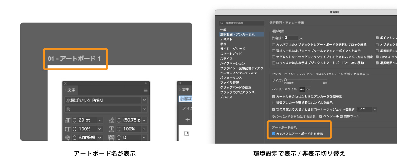 アートボードの左上にアートボード名が表示され、選択ツールやアートボードツールなどでアートボード名をダブルクリックすると名前を変更できます。これまではアートボードツールを選択した際やアートボードパネルで確認していましたが、デフォルトで表示されるようになったのは便利です。