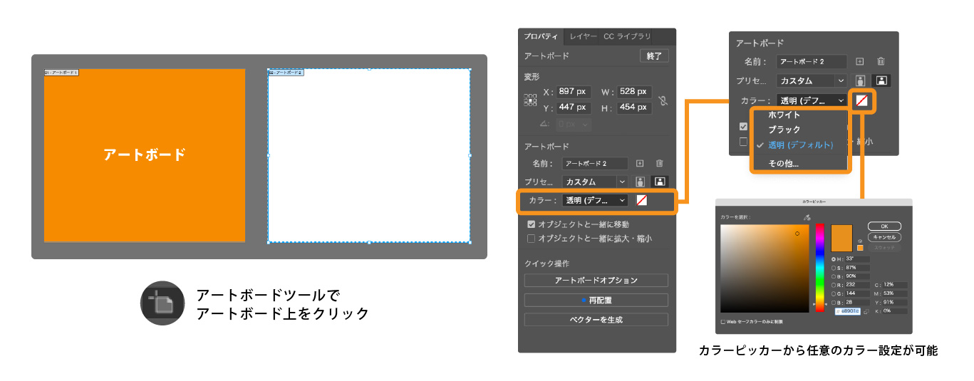 アートボードツールでアートボードを選択し、プロパティパネルの「カラー」から任意のカラーを指定すると背景色が設定可能になりました。新規ドキュメント作成時にも設定可能です。