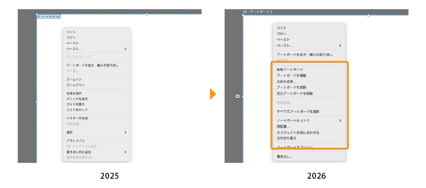 などができるようになっています。これらはアートボードツール使用時にアートボード上で右クリックするとメニューが表示されます。