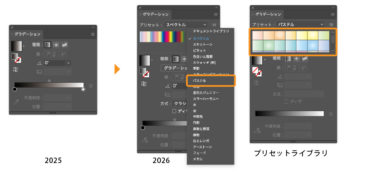 グラデーションパネルの上部にテーマ別にカテゴライズされたプリセットが追加されました。イメージに近いグラデーションをプリセットから選び、調整して使う流れが主流になりそうです。