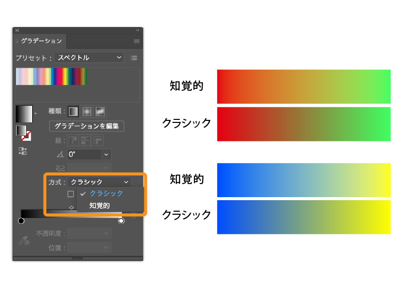 グラデーションの表現方法として「方式」や「ディザ」が追加され、より滑らかな色の移り変わりを表現可能になりました。「方式:クラシック」は従来方式、「方式:知覚的」はより自然な色のグラデーションになります。ディザを使用することで境目が自然になり、色ムラが目立たなくなります。