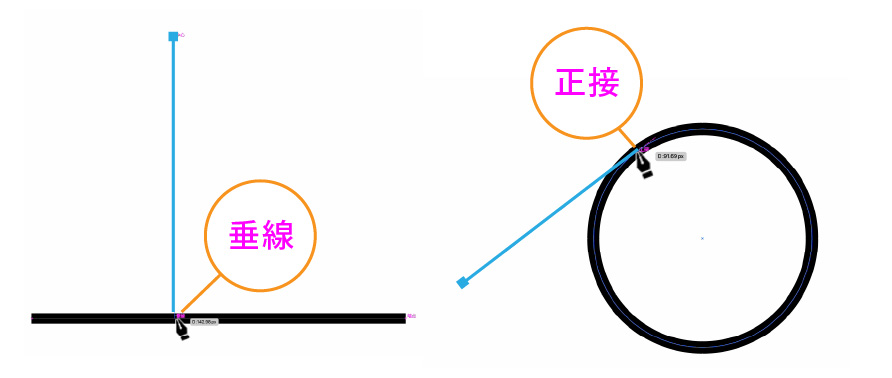 直線ツールやペンツールで線を描画する際に「垂線」「正接」のガイドが表示されるようになりました。