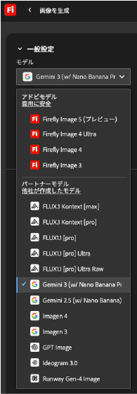 2025/11/21にAdobe Fireflyのパートナー(他社)モデルでGemini 3(通称 Nano Banana Pro)が使用できるようになりました。 このスクリーンショットはFirefly Web版(公式ホームページ)で、管理者からパートナーモデルの使用を許可された状態です。