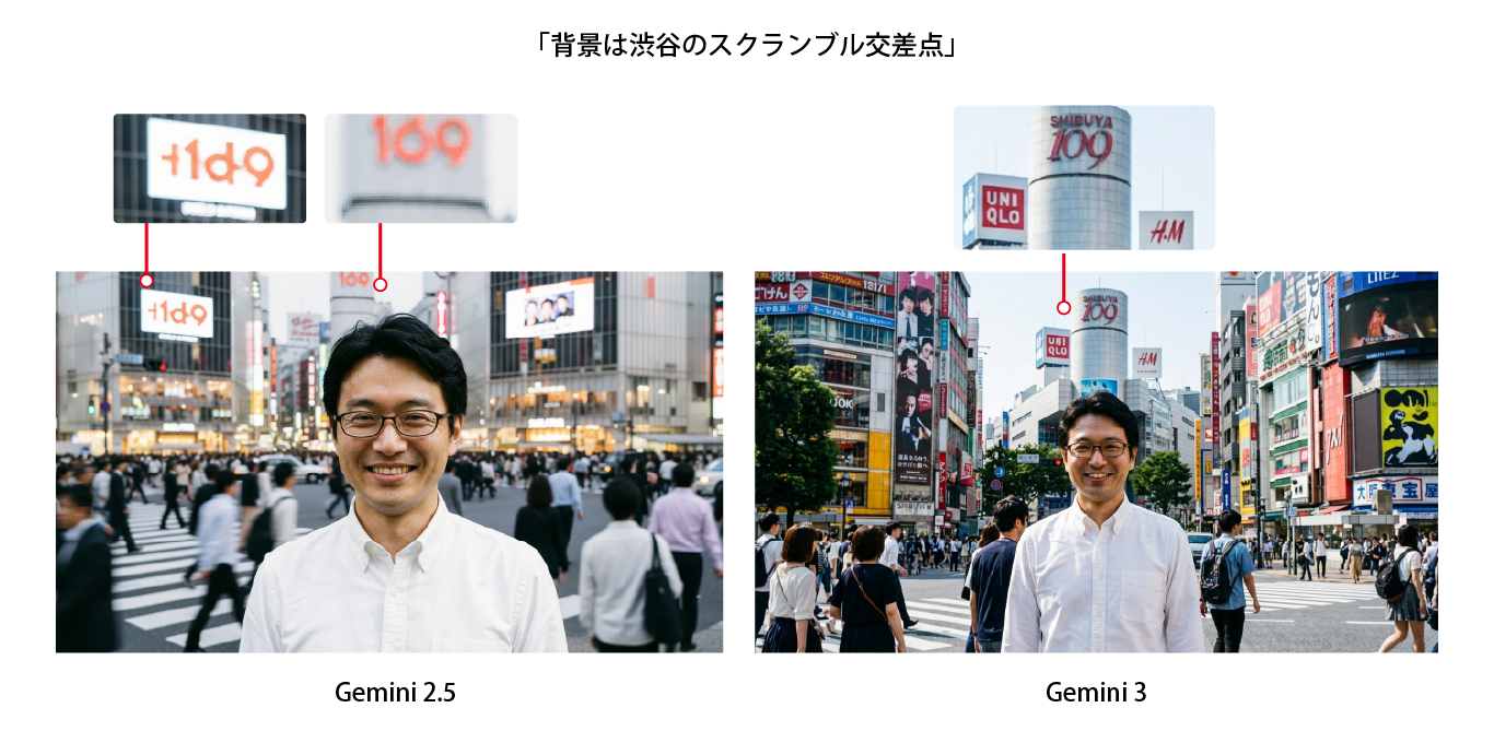 例えば男性の画像に対して「背景は渋谷のスクランブル交差点」と指示すると、Gemini 2.5では渋谷っぽい雰囲気はあるものの、道路や看板の文字表記がかなり不安定に見えます。