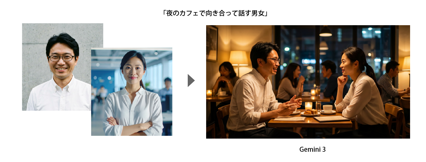先ほどの男性の画像と、もう一枚人物の画像を読み込ませ、プロンプトを「夜のカフェで向き合って話す男女」と指示すると、次のような結果になります。
