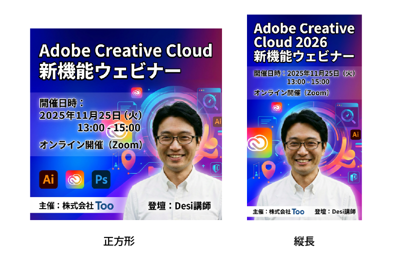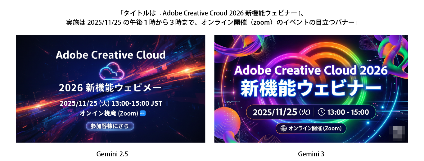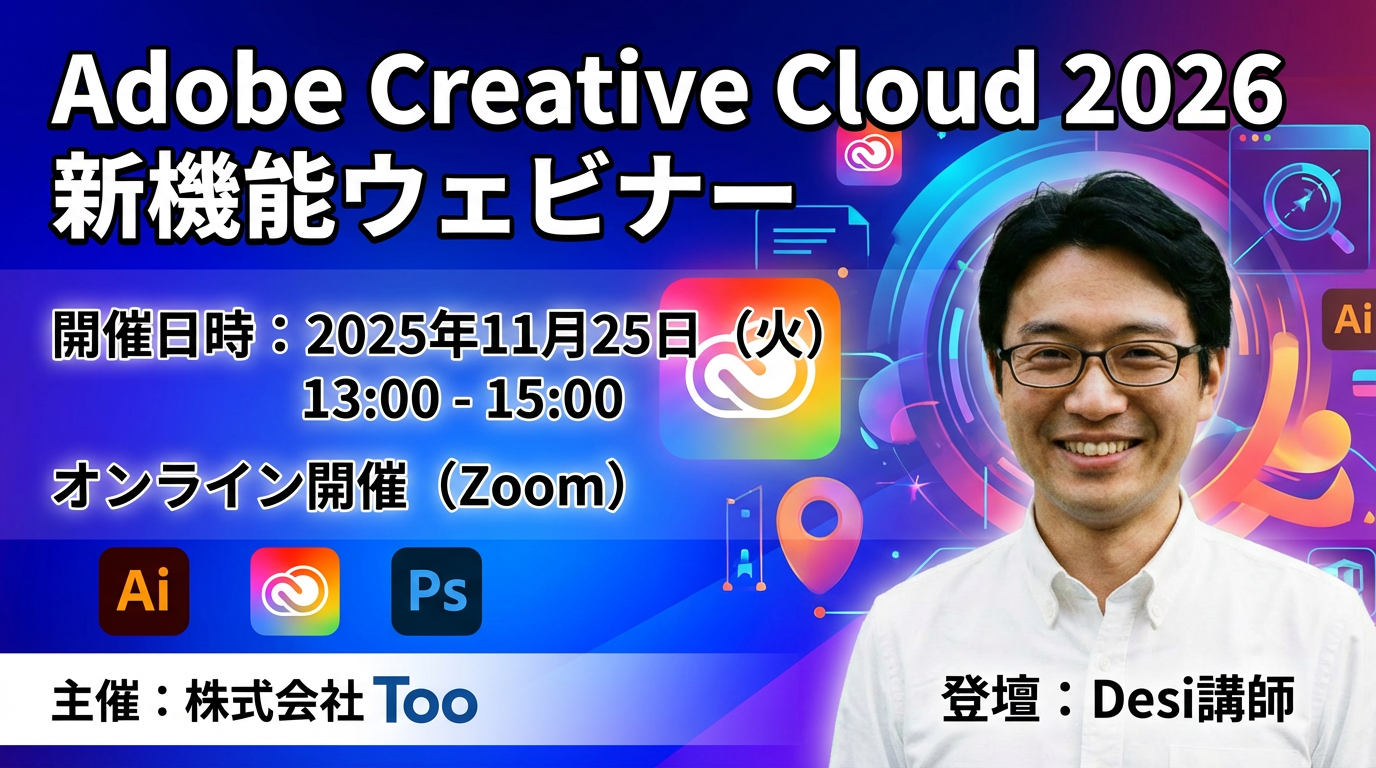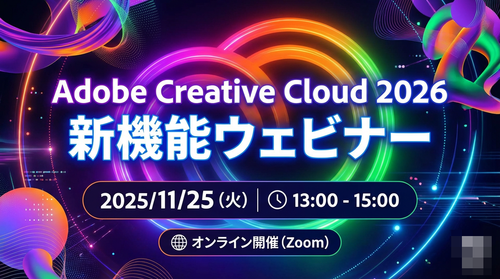 「タイトルは『Adobe Creative Cloud 2026 新機能ウェビナー』、実施は2025/11/25の午後1時から3時まで、オンライン開催(zoom)のイベントの目立つバナー」(イベント情報はダミーです)