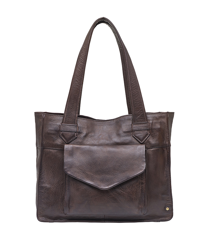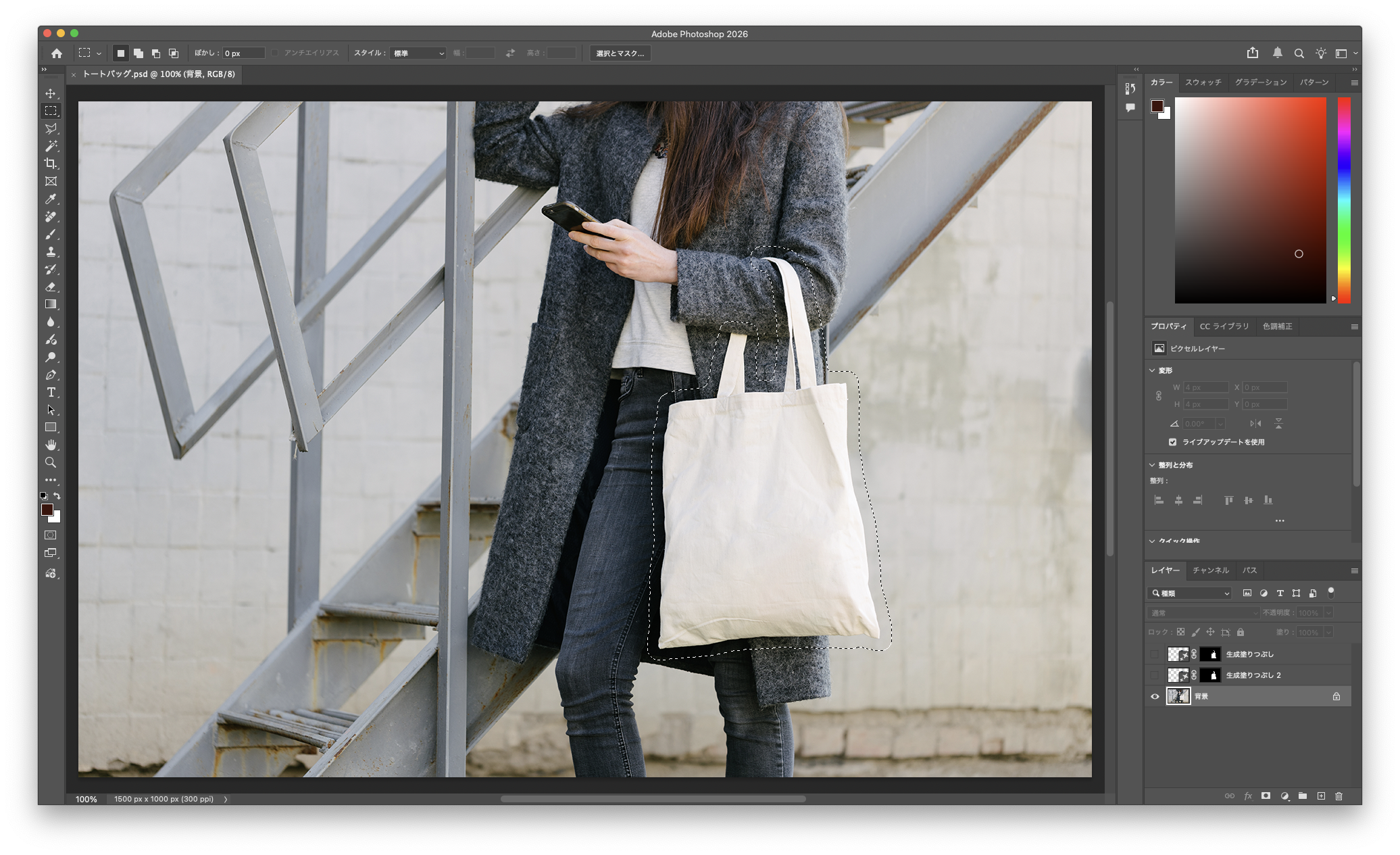 人物がトートバッグを持っている画像です。このトートバッグを別の画像の革カバンに置き換えます。