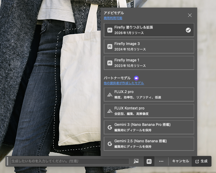コンテキストタスクバーの「生成塗りつぶし」をクリックし、モデルの切り替えボタンを押し「Firefly 塗りつぶし&拡張」を選びます。