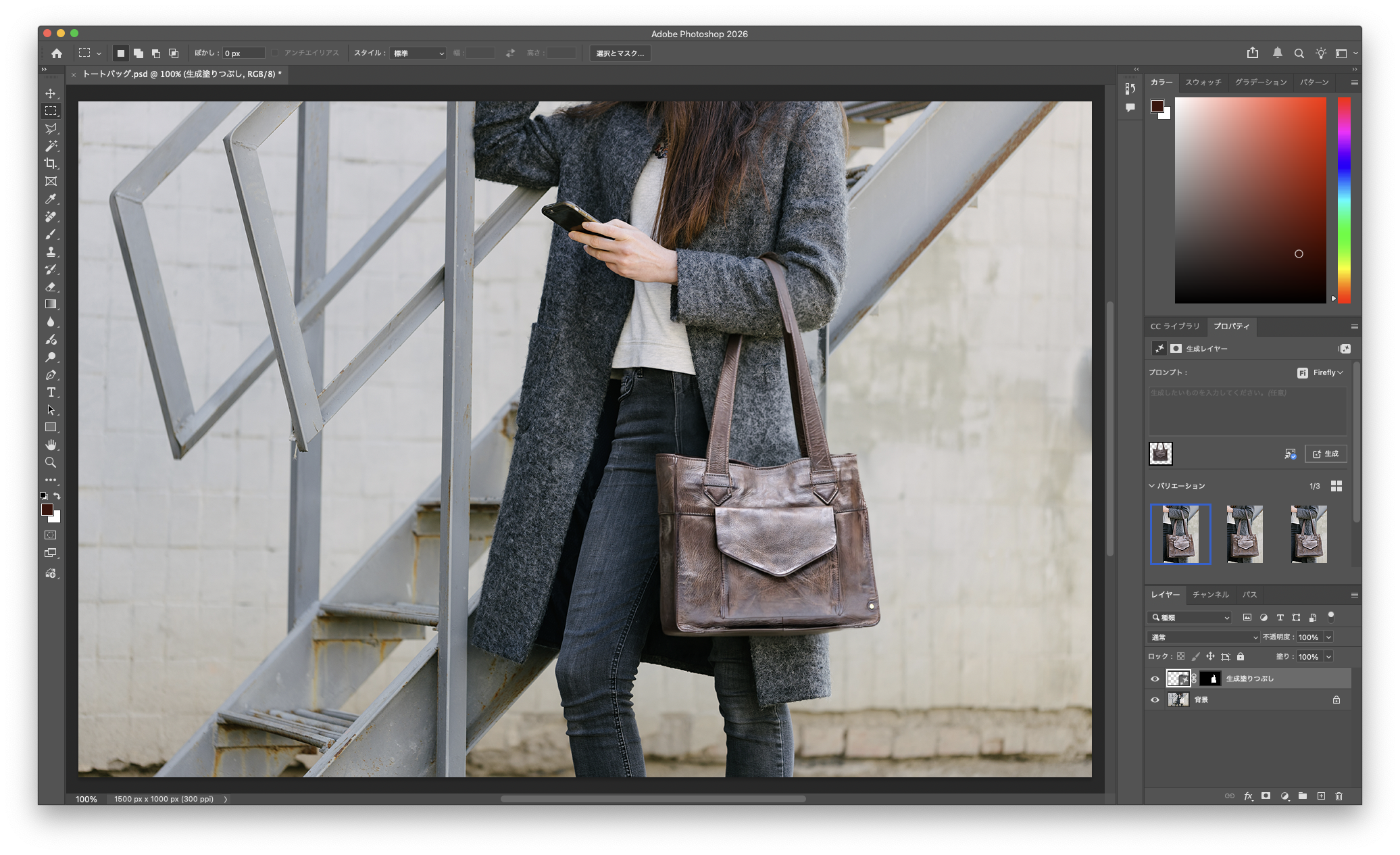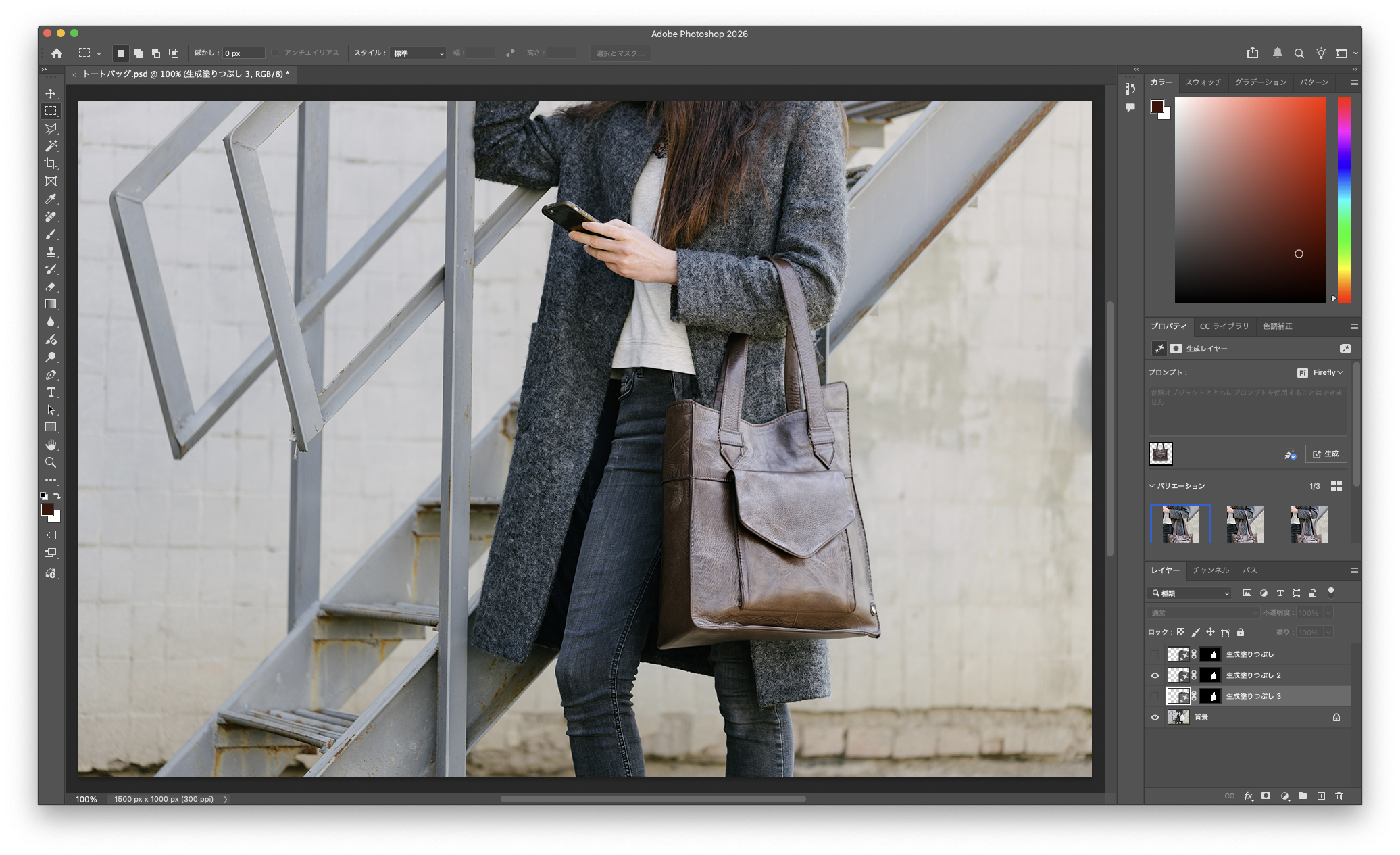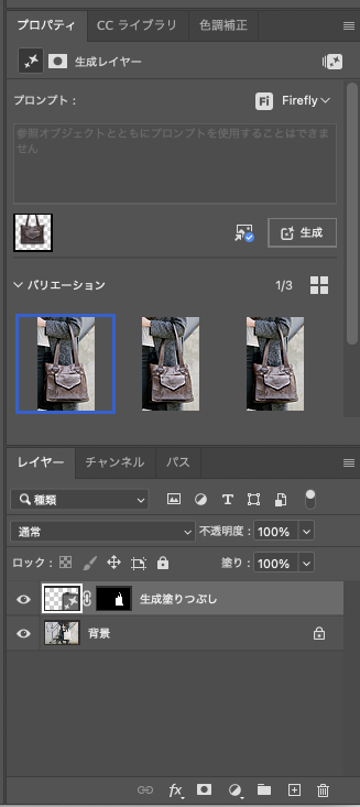 レイヤーを確認すると、通常の「生成塗りつぶし」と同様に別のレイヤーが作成され、そこにバリエーションが3種生成されますので、お好みの結果を選択してください。