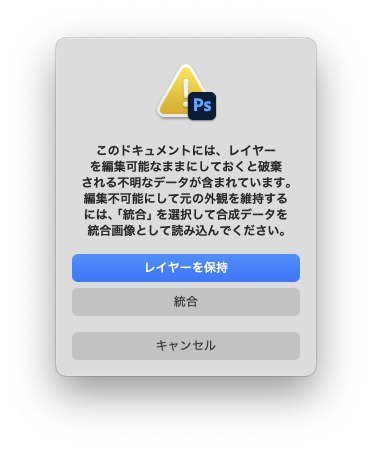 この機能が使用されたデータを下位バージョンで開くと、レイヤーの扱いについて同様のダイアログが出るのは同じなのですが、「レイヤーを保持」で開くと色調補正レイヤーの「自然な彩度」に置き換わってしまうため、「色温度/色かぶり補正」の情報は消え「自然な彩度/彩度」の情報だけが残ります。