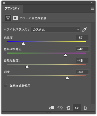 この機能を使うと、色温度・色かぶり補正・自然な彩度・彩度の4項目を1つの色調補正レイヤーでコントロールできます。今まで別々のレイヤーを重ねる必要があり面倒だった調整が、一括で管理できるようになりました。