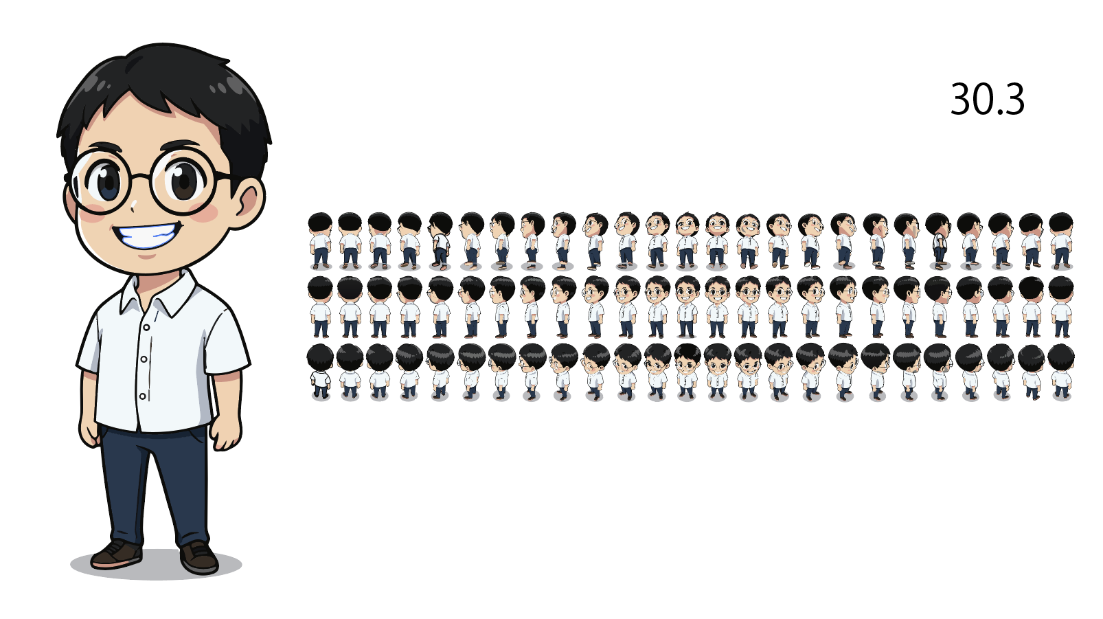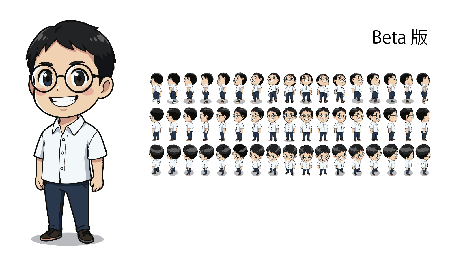 正面から描いたイラストを用意するだけで、生成AIが背面や側面などの描かれていない部分を補完し、まるで3Dモデルを扱うかのように、さまざまな角度のバリエーションを生成してくれます。生成された結果はラスタライズされずベクターデータのまま保持されるため、後から細かなパスの調整や色の変更ができるのが最大の魅力です。
