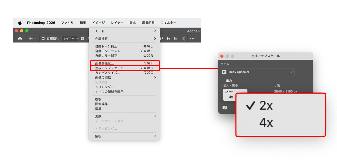 前田:おっしゃる通り、Photoshopの2026で「生成アップスケール」が使えるようになりました。これは従来の解像度アップ作業に代わるものになると期待されています。しかし現状では画像サイズは「2x(2倍)」か「4x(4倍)」しか選べませんので特定の画像サイズにする場合は従来の「画像解像度」で微調整が必要です。