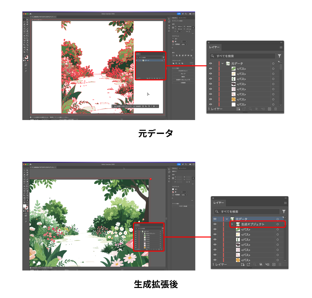 スタッフ:Illustratorでも「生成拡張」が使えるようになったのは驚きました。生成されたオブジェクトのレイヤー構造はどのようになっていますか?