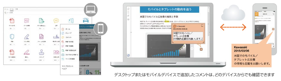 iPhoneなどのスマートフォンやiPadなどのタブレットでの使用にも最適化された、シンプルで直感的なユーザーインターフェイスを採用。一貫した操作性で、Acrobatの機能をモバイルデバイスでも利用できます。Mobile Linkを有効にすれば簡単に文書の共有が可能になります。どのデバイスからでも最新ファイルにアクセスでき、コメントの確認や追加などさまざまな作業が行えます。