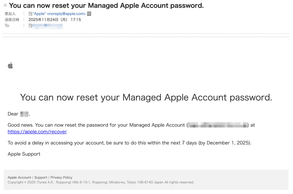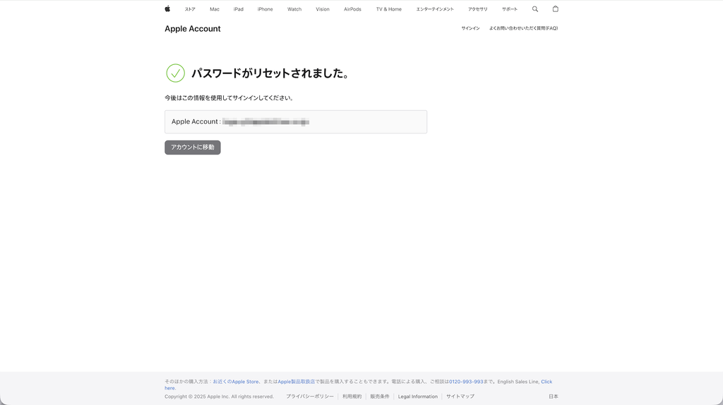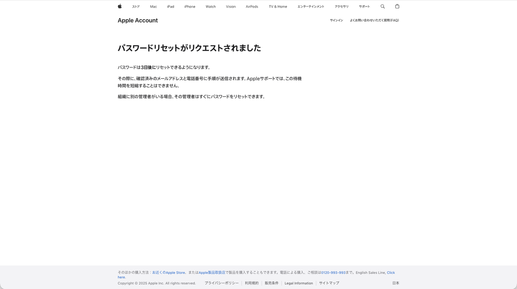 3日後にAppleからメールが届くため、記載のURLにアクセスし、パスワードをリセットします。