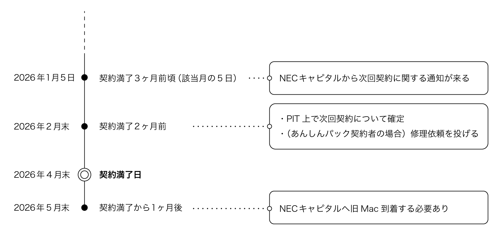 例えば、2026年4月末にAFSの契約満了を迎える場合のタイムラインは、以下の通りです。