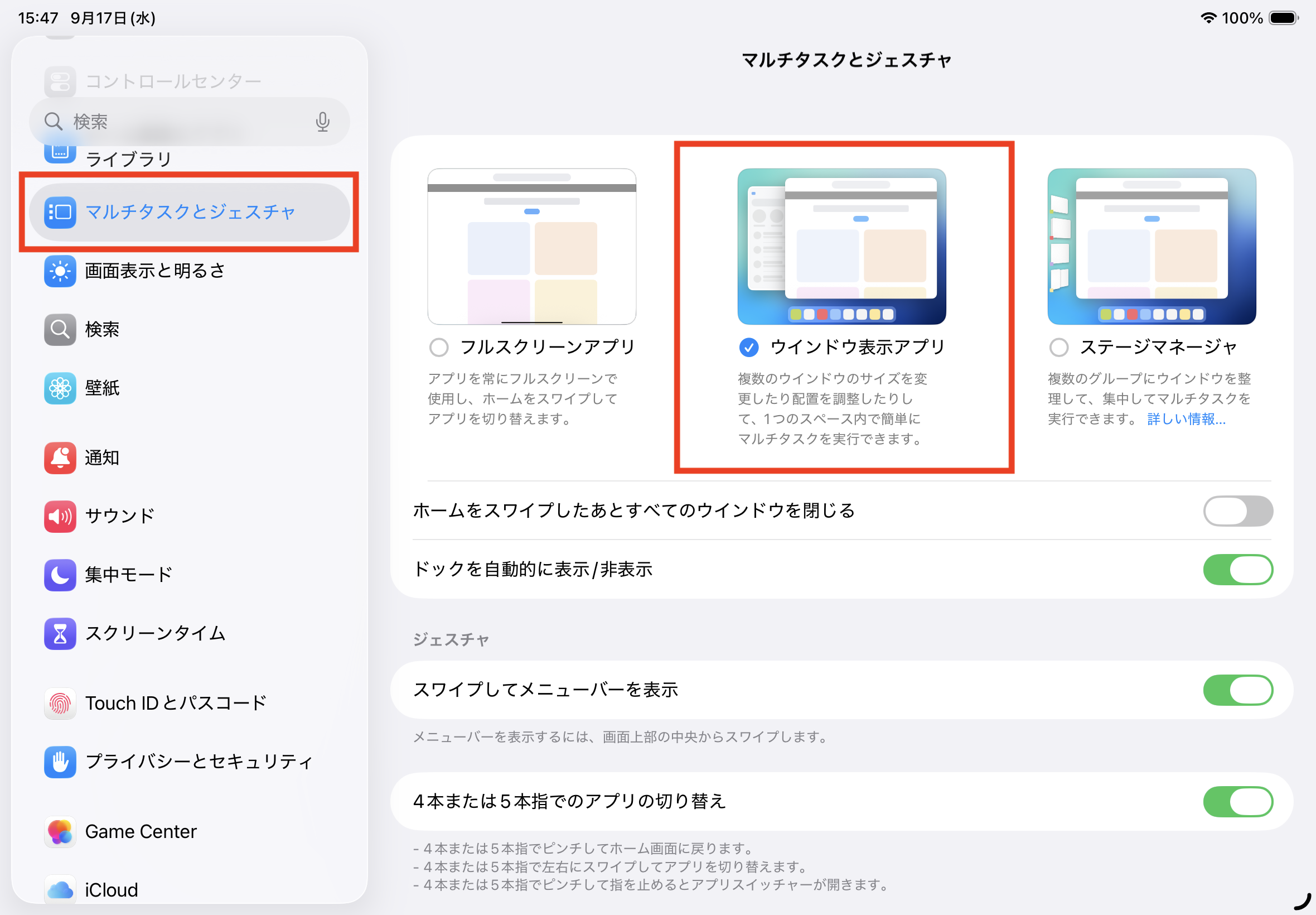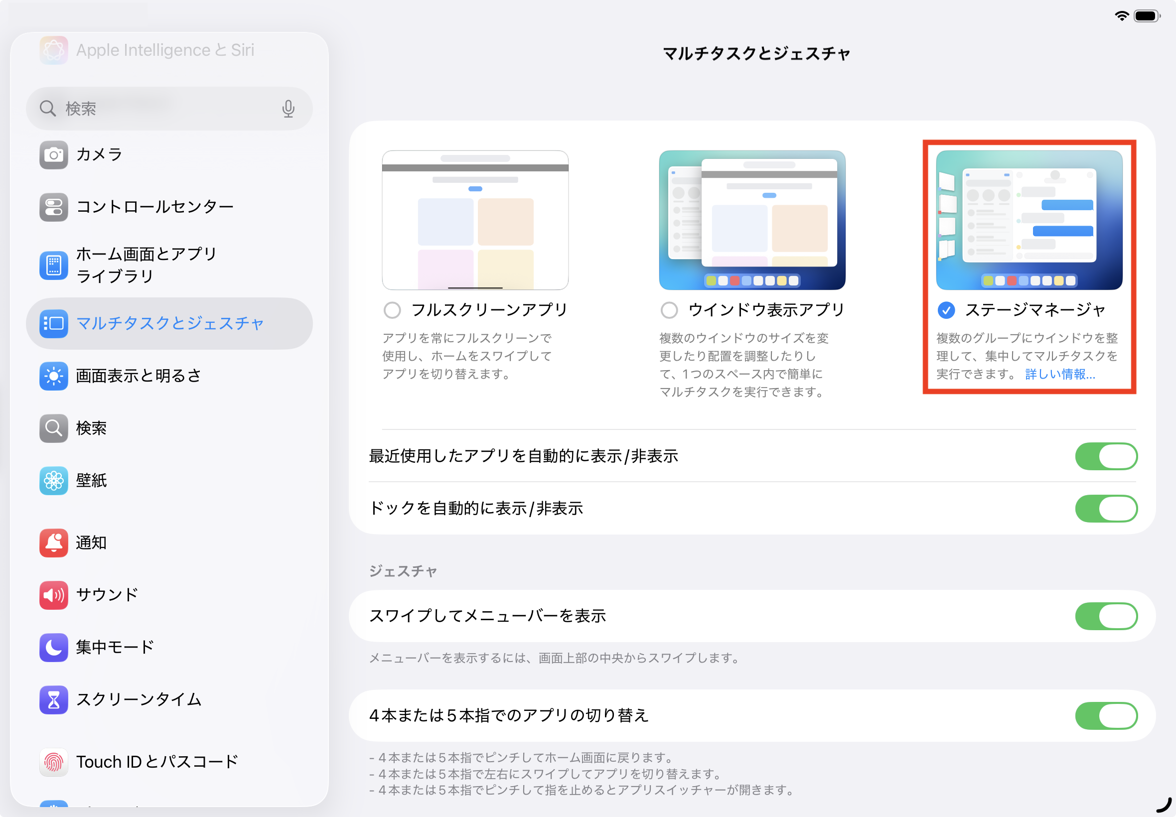 こちらは「設定>一般>マルチタスクとジェスチャ」より、「ステージマネージャ」を選択、