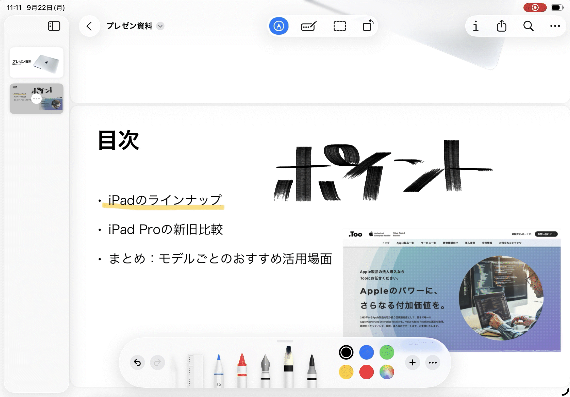 Apple Pencilを活用して授業ノートや教材に直接書き込むことができるため、 配布PDFに直接注釈や手書きを加え、即提出・共有 ・生徒作品レビューやグループワーク時の効率化へ といった使い方も考えられます!(福本)