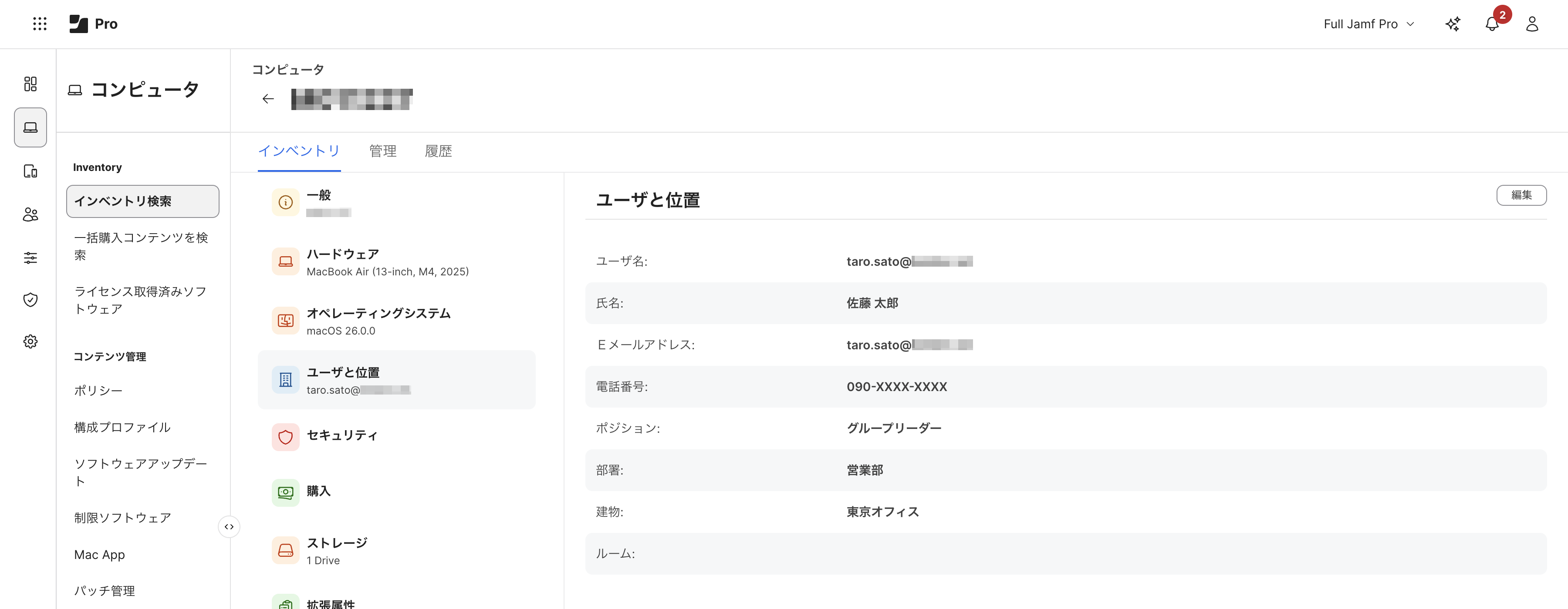 ユーザの所属する部署やオフィス情報をもとにしたグルーピングにも対応でき、例えば「〇〇部のみにアプリを配布」や「△△オフィスで稼働しているMacのみエクスポートして棚卸」などの柔軟で効率的なデバイス管理が実現できます。