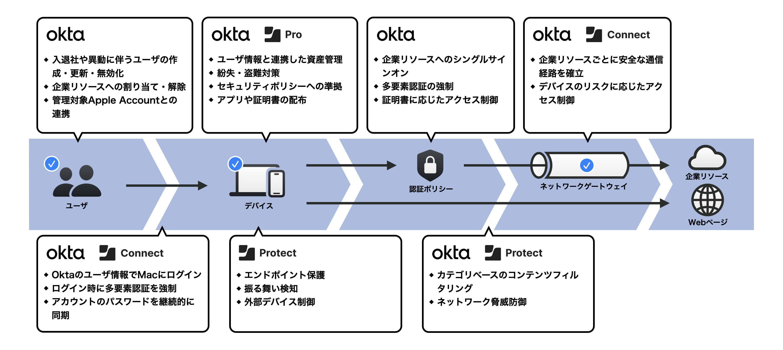 デバイス管理やエンドポイント保護だけでなく、OktaによるID管理とアクセス制御を統合することによって、デバイス、ユーザ、ネットワーク全体で信頼性を常に検証し、ポリシーベースの柔軟かつセキュアな運用が可能となります。
