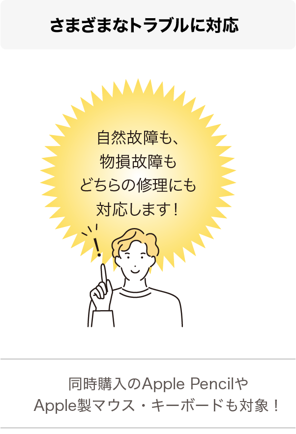 免責あり……AppleCare+ for iPadをご契約の場合は、過失や事故による損傷に対する修理を、1回につきiPadは4,400円(税込)、Apple PencilとApple製iPadキーボードは3,700円(税込)の料金で利用回数の制限なく受けることができます。AppleCare+ for MacBook / MacBook Pro / MacBook Air / Mac mini / iMacをご契約の場合は、過失や事故による損傷に対する修理を、画面または外部筐体の損傷は1回につき12,900円(税込)、そのほかの損傷は1回につき37,100円(税込)の料金で利用回数の制限なく受けることができます。