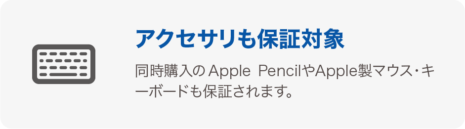 - 免責あり……AppleCare+ for Schools (iPad)をご契約の場合は、過失や事故による損傷に対する修理を、1回につきiPadは4,400円(税込)、Apple PencilとApple製iPadキーボードは3,700円(税込)の料金で1年間に2回まで受けることができます。AppleCare+ for Schools (Mac)をご契約の場合は、過失や事故による損傷に対する修理を、画面または外部筐体の損傷は1回につき12,900円(税込)、そのほかの損傷は1回につき37,100円(税込)の料金で1年間に2回まで受けることができます。