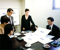 それを機に社内で「70周年記念事業委員会」が立ち上がり、やがて「CI委員会」へと発展し、時代に合わせた会社へと成長していくための本格的な「CI活動」が始まりました。コンピュータ化が進むデザイン業界に対応するため、さまざまな検討・議論を重ね、社内改革・サービスの見直し等を行ないました。