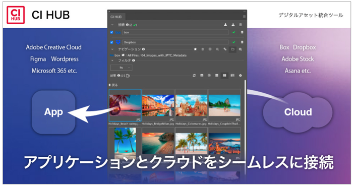 プラグインツール「CI HUB」なら、BoxやDropboxなどに保存された画像や動画などの素材データを、ダウンロードせずに直接IllustratorやPhotoshopなどのアドビ製品のパネルから選択することで簡単に利用可能になります。