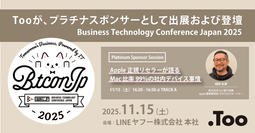 Tooは、40年以上にわたりApple製品を取り扱い、高い付加価値を提供するApple Premium Business Partnerとして、導入・運用・最適化を一気通貫で支援しています。本イベントでは、企業のApple製品導入を支える各種サービスを紹介します。ご来場の情報システム担当者・経営者の皆様と共にITインフラの側面から企業の成長を考える機会の創出を目指します。ぜひブースやスポンサーセッションにお立ち寄りください。